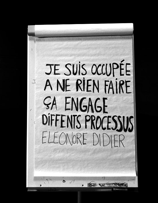 Simultanément aux performances présentées au Générateur, Éléonore Didier accueille plusieurs fois par soirée un unique spectateur. L’artiste-perforrmer expérimente et interroge ici la notion de performance en composant une spatialité subtile et tridimensionnelle qui englobe le corps du spectateur. C’est en l’espace interne et sensible du spectateur lui-même que l’œuvre a lieu. Cette pièce singulière est conçue comme un moment de transmission d’une personne à une autre. Ce qui s’y passe est en partie innommable et relève du secret. Il ne s’agit plus d’un mode de jeu traditionnel devant un public. Colaboratoire continental œuvre dans le cadre d’une relation entre deux individus, dans laquelle le performer prend en compte chaque spectateur. L’expérience pour le spectateur est à la fois intime et tout à fait inédite.